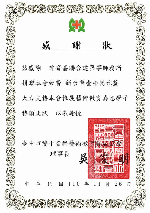 110年11月26日捐贈臺中市雙十國中音樂藝術教育發展協會經費十萬元整